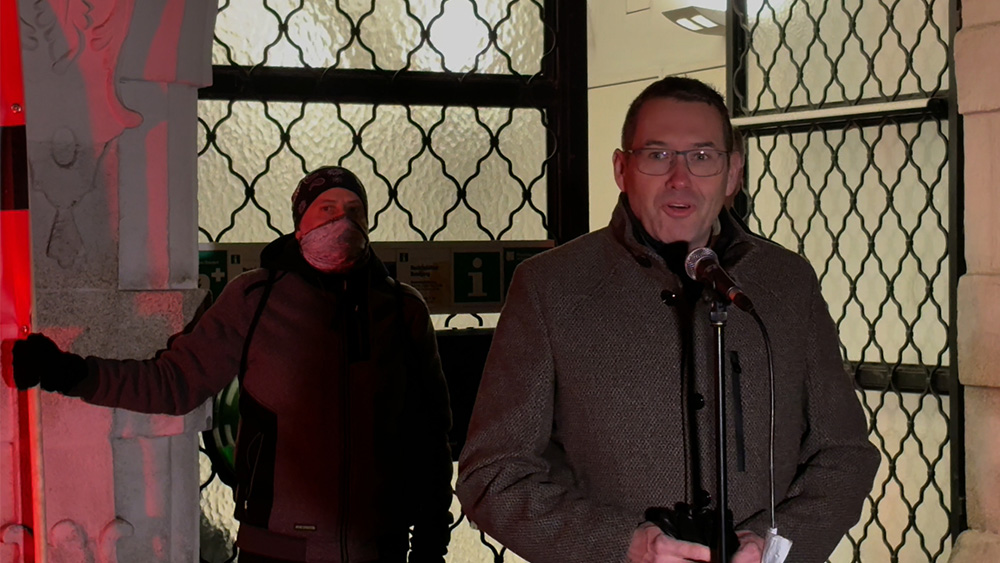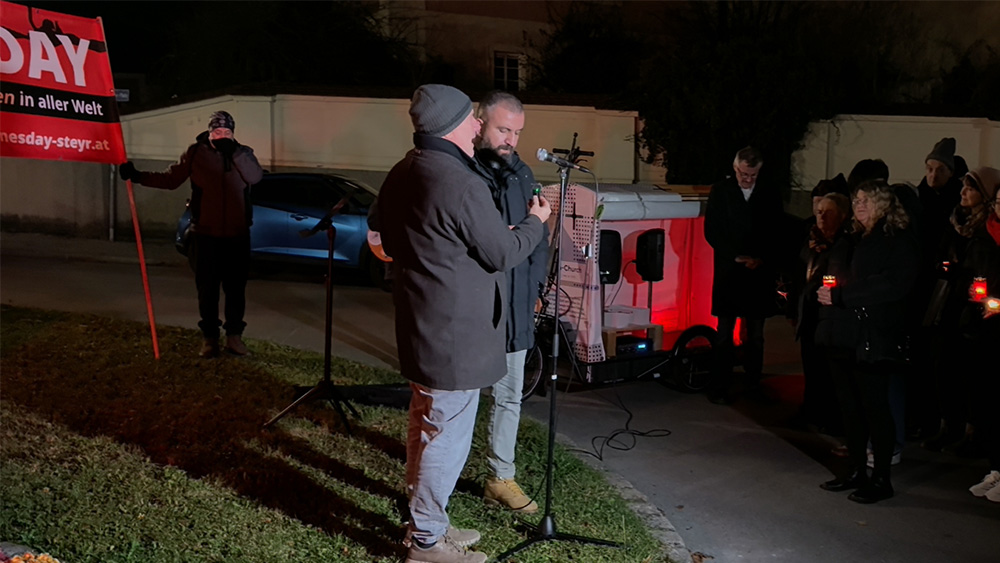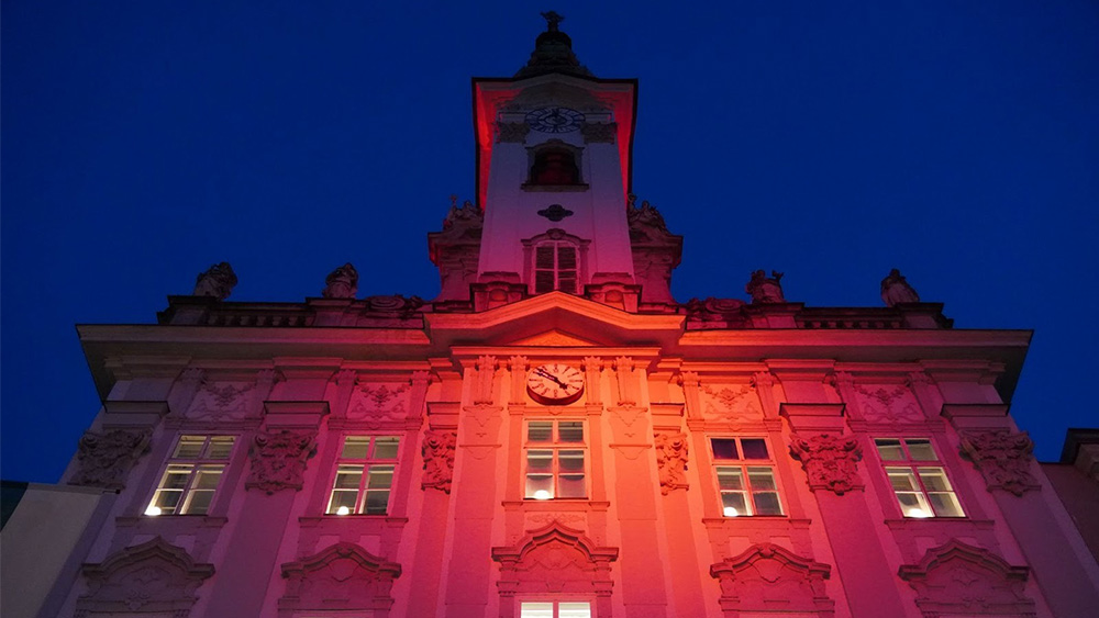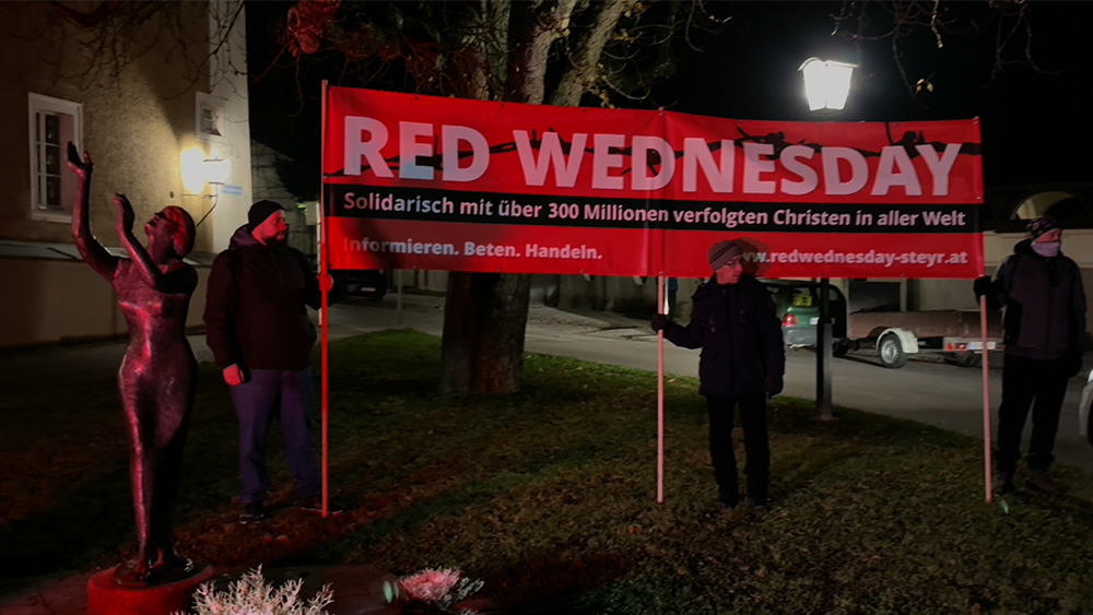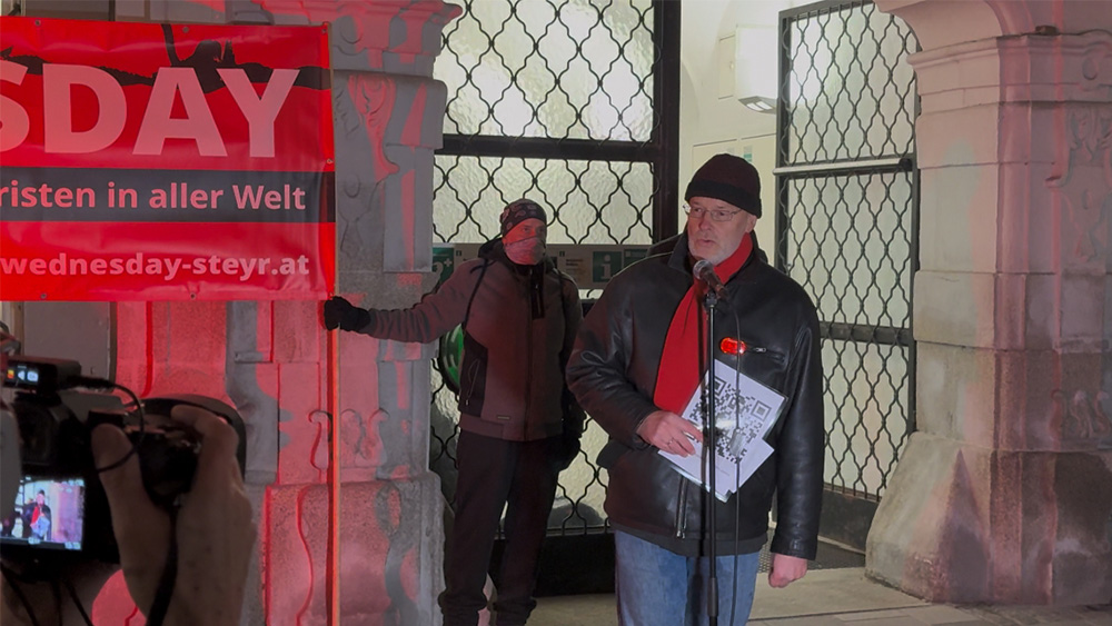 2025年11月19日傍晚,奥地利施泰爾市教區教堂(Stadtpfarrkirche Steyr)及多座著名公共建築被紅色燈光照亮,來自多個國家和地區的基督徒聚集在市政廳前參加「紅色星期三」(Red Wednesday)活動,通過静默游行和集體禱告等方式聲援全球超3.7億遭受迫害的基督徒。