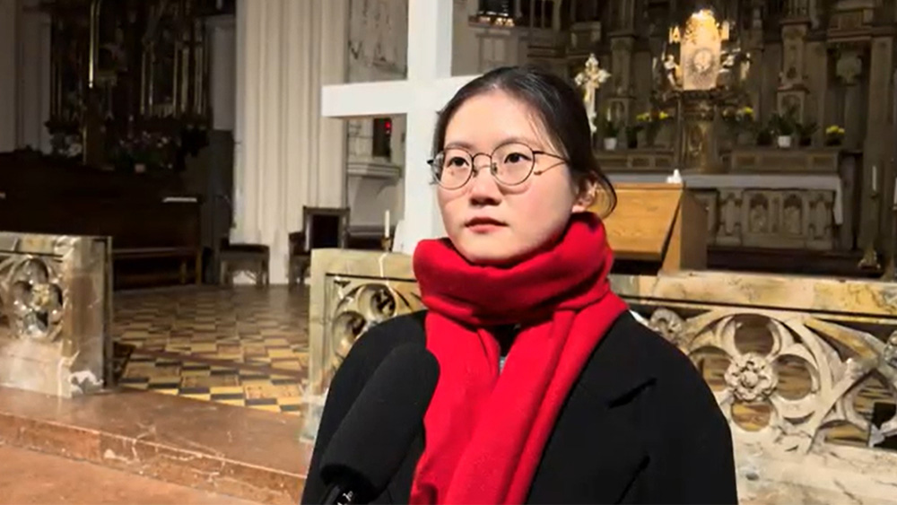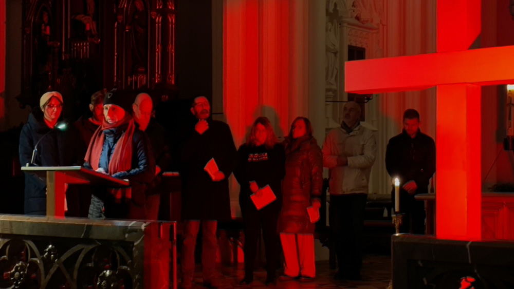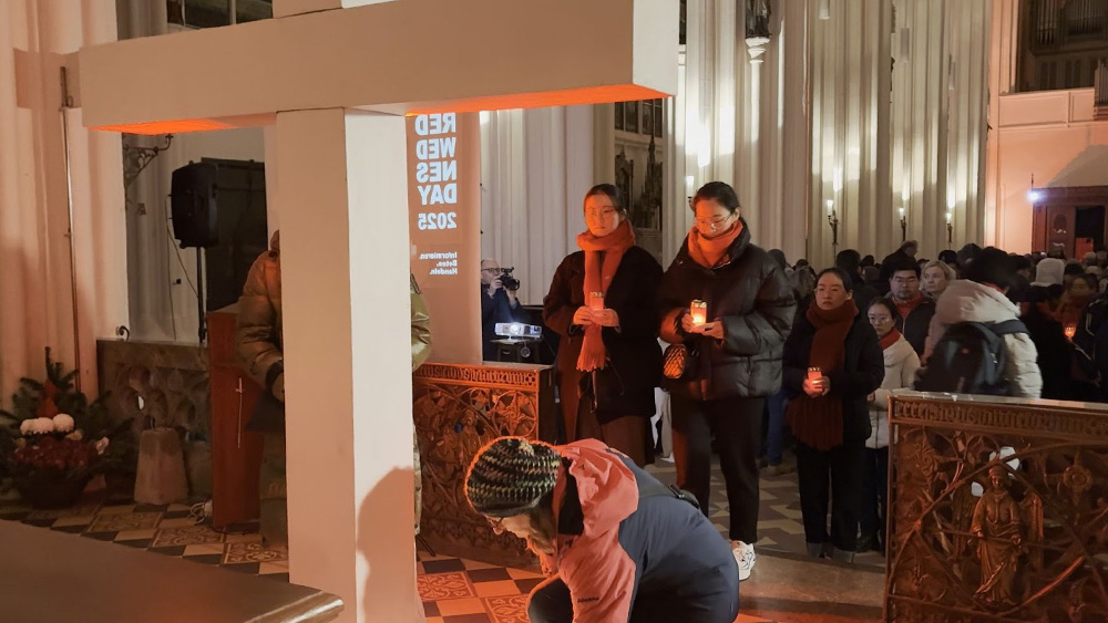 在施泰爾市教區教堂(Stadtpfarrkirche Steyr)内,基督徒依次將紅色蠟燭置于被紅光照亮的十字架前,為全世界受迫害的基督徒們禱告。