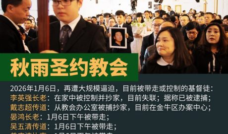 成都秋雨圣约教会遭遇大规模逼迫:李英强长老已经被逮捕,但目前还没有见到任何文书 2026年1月7日,本网据“秋雨圣约归正长老教会”2026年1月6日 21:10更新信息通报: 2026年1月6日,成都秋雨圣约教会及相关肢体遭遇大规模逼迫,根据目前已确认的信息,情况如下: 一、已被...阅读更多 2026-01-25 2026年1月25日