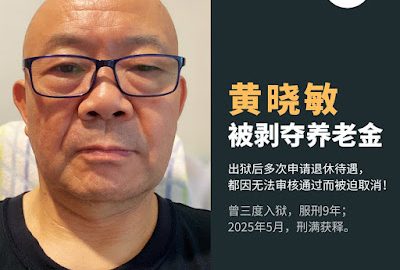 曾三度入狱的人权捍卫者黄晓敏养老金被剥夺 2026年3月10日,本网获悉:曾三度入狱,前后服刑共9年,2025年5月28日才刑满获释的人权捍卫者黄晓敏的养老金被剥夺。黄晓敏先生1962年生,现年64岁,其出狱后多次申请退休待遇,都因无法审核通...阅读更多 2026-03-11 2026年3月11日