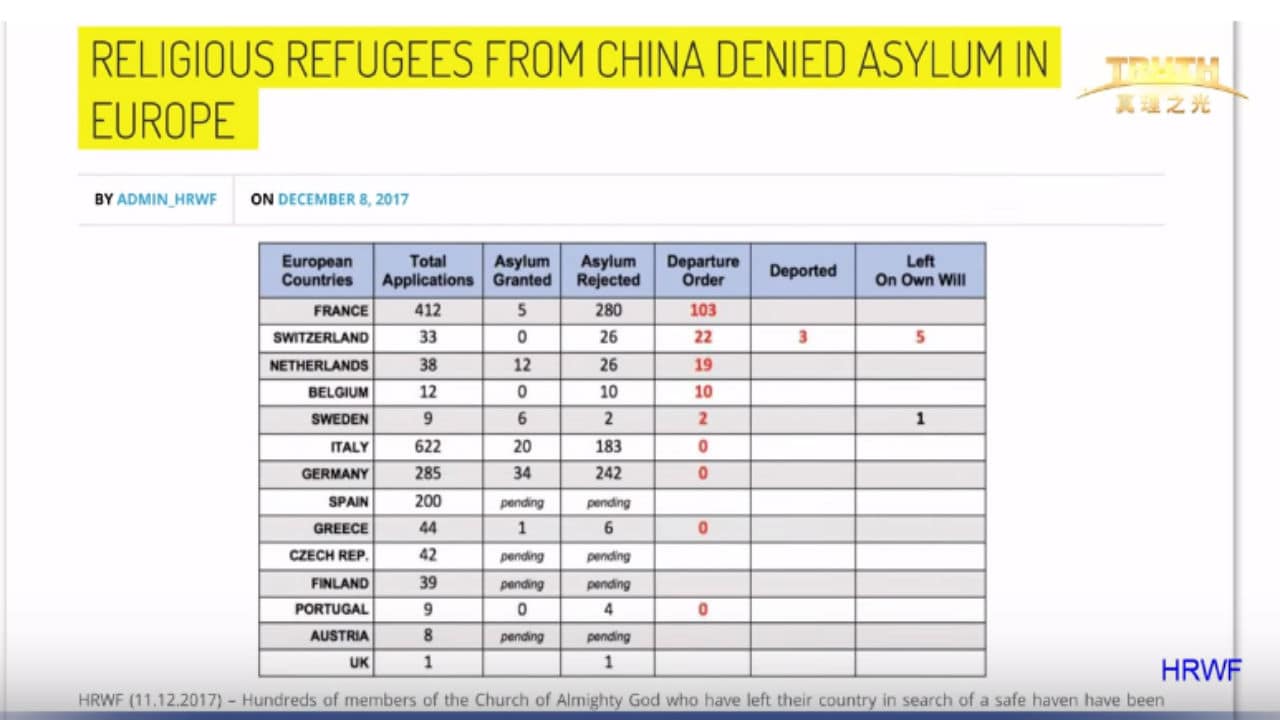 据了解,近年来,因中共政府的迫害,部分全能神教会基督徒逃亡到法国寻求庇护,但目前,这些基督徒的处境不容乐观。据“人权无国界”组织公布的相关数据显示,截至2017年12月1日,法国全能神教会的412个庇护申请者中有280人被拒绝,其中有 103人已经收到了离境令,随时面临被遣返回国。他们的遭遇引起了一些法国当地人士的关注,对他们表示同情和支持。