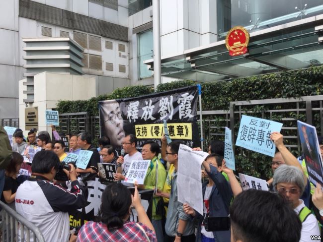 香港支联会、社民连、公民党郭家麒议员办事处等团体和政党,星期天中午发起“反对取消国家正副主席任期限制”的抗议示威,约40位代表在西区警署前集合发表短暂抗议声明后,游行至附近的中联办。示威者手拉“反对废除任期限制,结束专政”和“一党专政,无法无天;一帝专政,暗无天日”的大横幅,手举“要求人大代表投反对票”、“反对个人神化”、“反对复辟专制”等标语,一路高喊反对专制独裁的口号。
