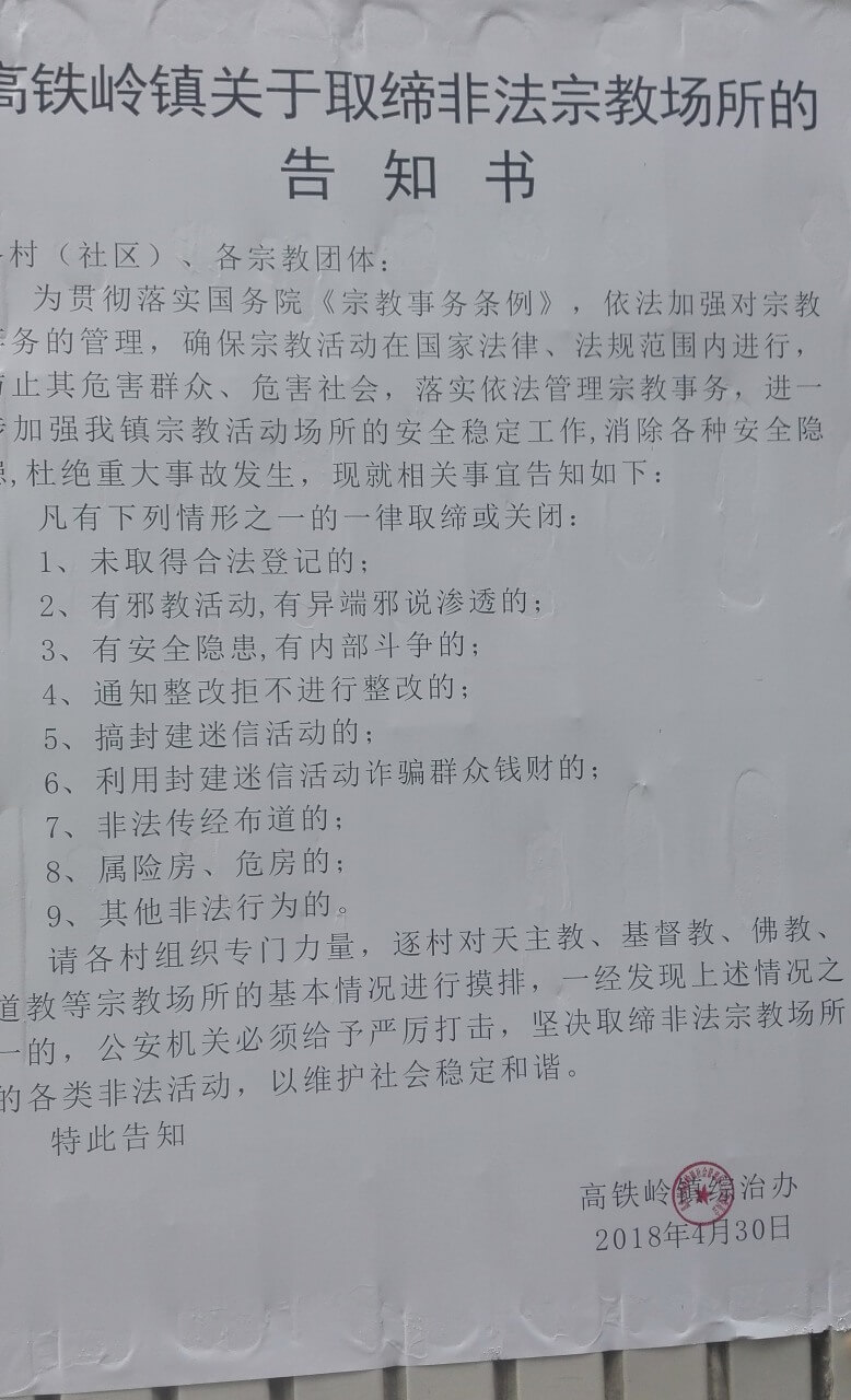 【本站讯】湖北省高铁岭镇综治办于2018年4月30日,下发了《关于取缔非法宗教场所的告知书》,责令各村组织专门力量,对天主教、基督教等宗教场所的基本情况进行摸排。5月5日下午,当地八斗耶稣教堂因被指未登记办证遭镇综治办查封。