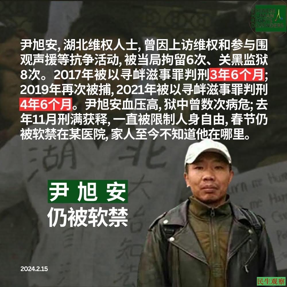 赴京看病而遭强迫失踪的湖北省大冶市人权捍卫者尹旭安已失联半个月 音讯全无 2025年8月25日,本网获悉:曾获刑4年半、出狱后又遭强迫失踪1年4个月的湖北省大冶市人权捍卫者尹旭安赴京看病最终于2025年8月11日晚上在北京上120急救车时被当局绑架,遭拦截遣返,现在已经失联...阅读更多 2025-08-25 2025年8月25日